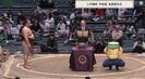 この巨大マカロンの授与を土俵上で補助したのは、先場所と同様に序ノ口呼出の隈二郎だ。隈二郎が土俵上で蹲踞(そんきょ)の姿勢でマカロンを顔の前で掲げると、その巨大さゆえに隈二郎の顔はマカロンにすっぽりと覆われてしまった。