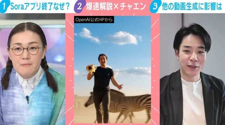 「一発屋みたいな感じ」動画生成AI「Sora」アプリ提供終了の裏側…起業家・チャエン氏が指摘する「3つの理由」とOpenAIの“正念場” わたしとニュース 2026/03/25 16:18 拡大する OpenAIの動画生成アプリ「Sora」が日本時間の25日朝、SNSでアプリのサービスを終了することを発表した。 ニュース番組『わたしとニュース』では、SNSでAI情報を発信している起業家のチャエン氏が終了の理由を解説した。 続きを読む