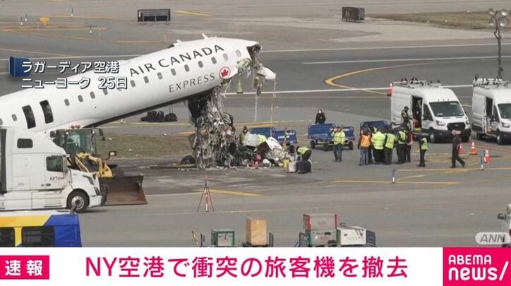 NY空港で衝突の旅客機を撤去 速報 2026/03/26 15:58 拡大する ニューヨークの空港で旅客機と消防車が衝突し2人が死亡した事故で、発生から2日以上経ち滑走路に残されていた機体が撤去されました。 ニューヨークのラガーディア空港で22日、エア・カナダ系の旅客機が着陸した際に消防車と衝突し、パイロット2人が死亡しました。 機体は滑走路に残されたままでしたが、事故発生から2日以上経った25日に撤去作業が行われました。 衝突で大破した機首部分の残骸が回収されたあと、機体は滑走路の外にロープを使って牽引されました。 続きを読む