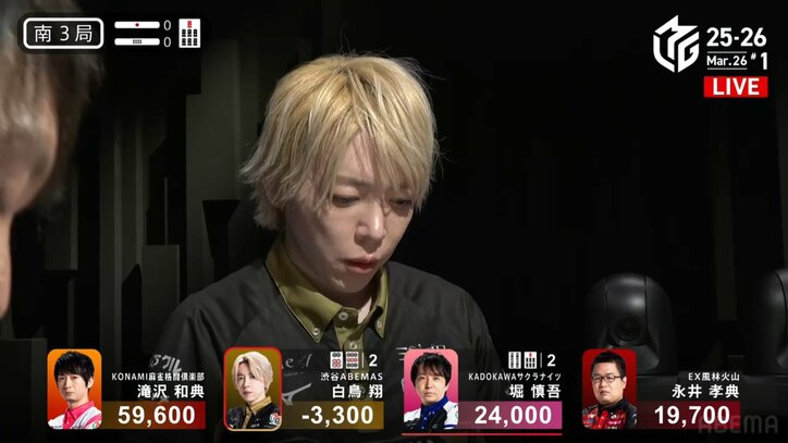 「マジ鳥肌」「激アツ」追い詰められた白鳥翔が見せた鳳凰位の真価 どん底から復活した倍満ツモが巻き起こした熱狂の渦/麻雀・Mリーグ Mリーグ 2026/03/27 11:00 拡大する 「大和証券Mリーグ2025-26」3月26日の第1試合で、渋谷ABEMASのエース・白鳥翔(連盟)が、チームの窮地を救う劇的な倍満ツモを披露。プロ麻雀連盟の最高峰タイトル「鳳凰位」の意地と執念を、その右腕に宿してみせた。 場面は南3局。レギュラーシーズン突破のボーダーラインである6位を必死に追う7位の渋谷ABEMASにとって、この日は一戦たりとも落とせない正念場。しかし、先発した白鳥は東場の失点が響き、一時は-1万1900点まで沈む苦しい展開を強いられていた。南3局の時点でも-3300点と、依然としてラス目という絶体絶命の状況だ。 続きを読む