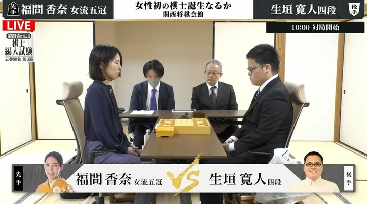福間香奈女流五冠、注目の棋士編入試験第3局!後がない状況から初勝利なるか 試験官・生垣寛人四段と対局開始 将棋 2026/03/27 10:01 拡大する 将棋の福間香奈女流五冠(清麗、女王、女流王座、女流王位、倉敷藤花、34)が挑む棋士編入試験第3局が3月27日、大阪府高槻市の「関西将棋会館」で行われ、午前10時に生垣寛人四段(22)との対局を開始した。 試験は若手棋士5人と対戦する五番勝負。3勝を挙げれば合格となるが、福間女流五冠は第1局では山下数毅四段(17)に、第2局は片山史龍四段(21)に敗れて後がない状況となっている。史上初の女性の棋士誕生へ、崖っぷちから巻き返しを図ることができるか。 続きを読む