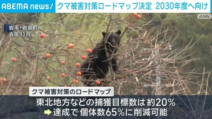 クマ被害対策ロードマップ決定 2030年度へ向け 速報 2026/03/27 17:50 拡大する 全国でクマ被害が相次いだことを受け、政府は、2030年度時点での個体数の目標や、それを達成するための地域ごとの捕獲数などを掲げたロードマップを決定しました。 きょう開かれた関係閣僚会議で決定したクマ被害対策のロードマップは、地域ごとに個体数の管理を強化するため、2030年度までに捕獲する目標数を設定しています。 被害の大きかった東北地方などでは、自然に増加する割合を5パーセント余り上回るおよそ20パーセントとなっています。 続きを読む