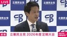 29日、立憲民主党の党大会が開催された。来賓として挨拶に立った中道改革連合の小川淳也代表は「思わず『ただいま』と言いたくなる気持ちをぐっとこらえて、きょうこの場に立たせていただいている」と述べた。