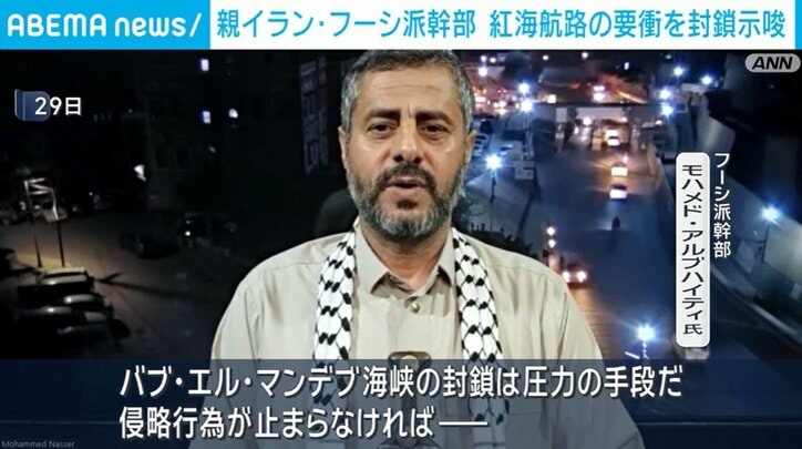 親イラン・フーシ派幹部 紅海航路の要衝を封鎖示唆 速報 2026/03/30 13:10 拡大する イラン情勢が緊迫するなか、イスラエルへの攻撃を開始したイエメンの親イラン武装組織「フーシ派」の幹部がANNの取材に応じ、海上交通の要衝である新たな海峡の封鎖を示唆しました。フーシ派・モハメド・アルブハイティ氏「バブ・エル・マンデブ海峡の封鎖は圧力の手段だ。侵略行為が止まらなければ、イエメンは関与した国々に対して、この手段を用いざるを得なくなるだろう」 フーシ派の幹部アルブハイティ氏は29日、このように述べたうえで、海峡を通過する船舶から通航料を徴収することも今後、検討するとしました。 続きを読む