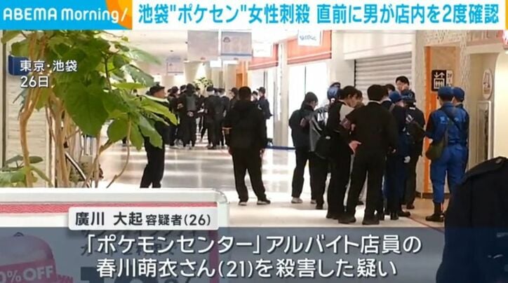 池袋“ポケセン”女性刺殺 直前に男が店内を2度確認 速報 2026/03/31 08:12 拡大する 東京・池袋の商業施設で女性が元交際相手の男に殺害された事件で、直前に男が現場となった店内の様子を2度確認していたことがわかりました。 廣川大起容疑者(26)は、豊島区池袋にある「ポケモンセンター」で、アルバイト店員の春川萌衣さん(21)を刃物のようなもので殺害した疑いがもたれていて、自らも切りつけ死亡しました。 その後の捜査関係者への取材で、廣川容疑者が事件のおよそ15分前に店内の様子を外から2度確認していたことがわかりました。 続きを読む