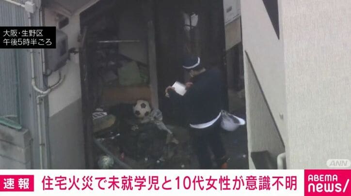 住宅火災で未就学児と10代女性が意識不明 速報 2026/03/31 18:34 拡大する 大阪市生野区の住宅で火事があり、10代の女性と未就学児の女の子の合わせて2人が搬送されましたが、いずれも意識不明ということです。 午後4時前、大阪市生野区の住宅で「2階から煙が出ている」と近くに住む男性から通報がありました。 消防によりますと、火はおよそ20分後にほぼ消し止められ、この住宅から10代と未就学児の女性2人が救出されましたがいずれも重傷で意識がないということです。 警察と消防が被害の確認を進めています。(ANNニュース) 続きを読む