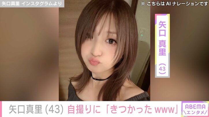“整形疑惑を否定”矢口真里「色んな意味できつかったwww」自撮り写真を公開 ABEMAエンタメ矢口真里 2026/03/31 18:44 拡大する タレントの矢口真里(43)が、「色んな意味できつかったwww」とつづった自撮りショットを公開した。 これまでにもInstagramで、たびたび自撮りショットを公開してきた矢口。2026年1月6日の投稿では、車内での動画をアップすると「整形してますか?顔違いますけど」というコメントが寄せられ、「してませんけど」と困惑した反応も見せていた。 3月29日にはストーリーズを更新し、「ミニモちゃん プロレスデビューおめでとう 両国国技館で、しかも東京女子プロレスさん達が戦うリングでって、普通にすごくない!?」と、アイドルグループ「ミニモニ。」の公式キャラクター「ミニモちゃん」がプロレスデビューしたことを報告。続けて「ミニモちゃんの応援でミニモニ。着たよ。衣装が色んな意味できつかったwww」と自虐交じりにつづり、自撮りショットを公開した。 続きを読む