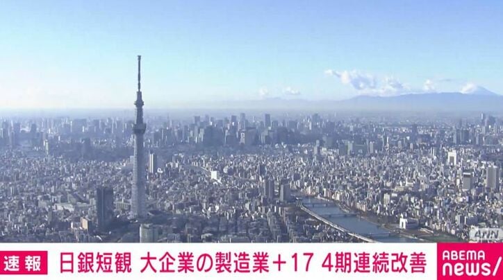 日銀短観 大企業の製造業+17 4期連続改善 速報 2026/04/01 10:04 拡大する 日本銀行はさきほど、3カ月ごとに企業の景況感を調査する短観=全国企業短期経済観測調査の最新の結果を発表しました。 代表的な指標である大企業の製造業の景気判断を示す指数はプラス17となり、去年12月の調査から1ポイント改善しました。4期連続の改善で、2021年12月以来の水準です。 大企業の非製造業はプラス36と横ばいでした。 一方で先行きの見通しは、ほぼ全ての業種で悪化しました。大企業の製造業では3ポイント、非製造業では7ポイント悪化しました。(ANNニュース) 続きを読む