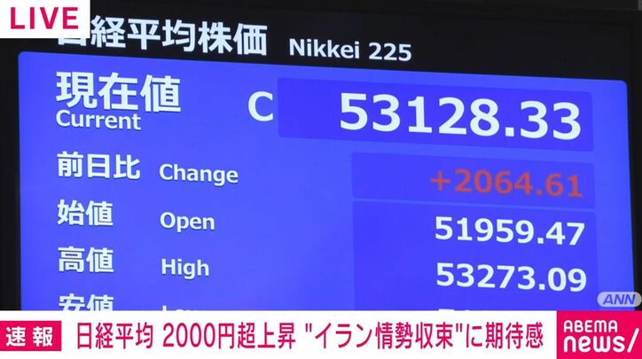 日経平均 2000円超上昇 “イラン情勢収束”に期待感 速報 2026/04/01 11:51 拡大する きょうの日経平均株価は、イラン情勢が収束するという期待を背景に大きく値上がりし、上げ幅は2000円を超えています。午前の終値はきのうより2064円高い5万3128円でした。 市場関係者は、アメリカのトランプ大統領が今後2、3週間でイランから撤退する見通しを示したため、事態の収束への投資家の期待が高まったとみています。また、原油価格が落ち着けば企業業績にプラスになるため、株式市場に資金が向かっていると指摘しています。 続きを読む