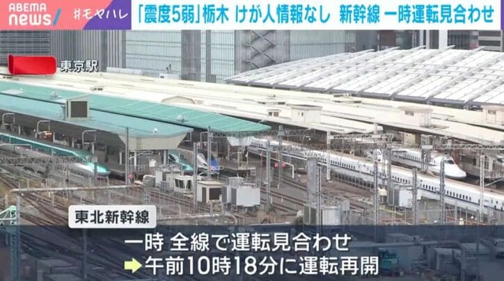 「震度5弱」栃木 けが人情報なし 新幹線 一時運転見合わせ 速報 2026/04/01 13:06 拡大する 栃木県で最大震度5弱を観測した地震で、これまでにけが人などの情報はありませんが、新幹線が一時運転を見合わせるなど影響が出ています。 JR東日本によりますと、東北新幹線は一時、全線で運転を見合わせましたが、午前10時18分に運転を再開しました。 栃木県の警察や消防によりますと、これまでに大きな被害の情報は入っていませんが、震度5弱を観測した真岡市にある真岡病院では、エレベーターが1基止まりました。閉じ込められた人はいませんが、復旧のめどはたっていないということです。 続きを読む