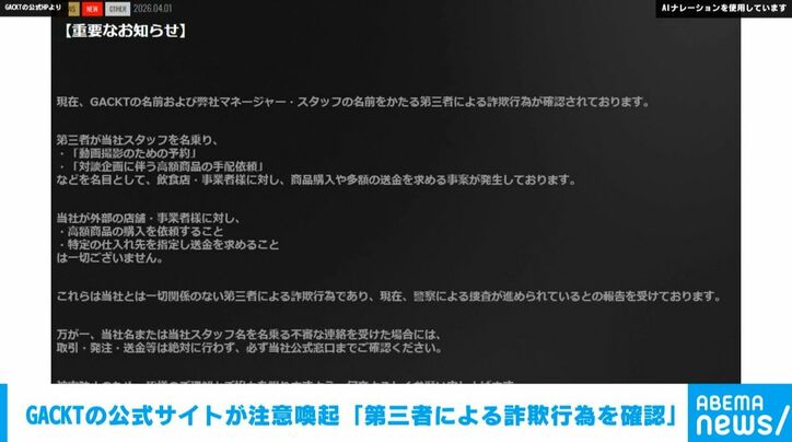 GACKTの公式サイトが注意喚起「第三者による詐欺行為を確認」 速報 2026/04/01 17:57 拡大する GACKTさんの公式サイトが更新されました。「【重要なお知らせ】現在、GACKTの名前および弊社マネージャー・スタッフの名前をかたる第三者による詐欺行為が確認されております。第三者が当社スタッフを名乗り、 ・「動画撮影のための予約」 ・「対談企画に伴う高額商品の手配依頼」 などを名目として、飲食店・事業者様に対し、商品購入や多額の送金を求める事案が発生しております。当社が外部の店舗・事業者様に対し、 ・高額商品の購入を依頼すること ・特定の仕入れ先を指定し送金を求めること は一切ございません。 続きを読む