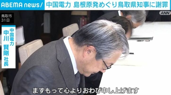中国電力 島根原発めぐり鳥取県知事に謝罪 速報 2026/04/01 18:45 拡大する 中国電力は、2029年度に島根原発でプルサーマル発電を開始する見通しと発表したことについて、説明不足だと批判していた鳥取県の平井知事に対し謝罪しました。中国電力 中川賢剛社長「まずもって心よりおわび申し上げます」 中国電力は2月、島根原発2号機でプルサーマル発電を2029年度に開始する見通しだと発表し、鳥取県の平井知事が十分な説明を受けていないと批判していました。 中国電力の中川賢剛社長はきのう、鳥取県庁で平井知事に「行程ありきと取られかねない説明だった」と謝罪し、安全の検証などを行うと説明しました。 続きを読む