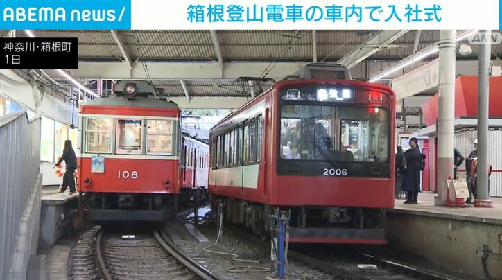 箱根登山電車の車内で入社式 速報 2026/04/01 18:39 拡大する きょうから4月です。新たな一歩を踏み出す新社会人の入社式が各地で行われる中、神奈川県箱根町では、観光地ならではのユニークな入社式が開かれました。 箱根の交通と観光を運営する「株式会社小田急箱根」では、箱根登山電車の旧型車両の車内を会場にした入社式が開かれました。この車両は、100年以上にわたり箱根の山を走り続けてきた「100形」車両で、現役としては国内で最も古い電車です。 車内では、水上秀博社長の祝辞のあと、新入社員に辞令が手渡され、新入社員の代表が車内放送用のマイクを使って誓いの言葉を述べました。 続きを読む
