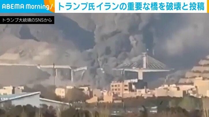 トランプ氏 イランの重要な橋を破壊と投稿 速報 2026/04/03 09:25 拡大する アメリカのトランプ大統領がイランの重要な橋を破壊したと投稿しました。これに対し、イラン側も報復を宣言しています。 トランプ大統領は2日、自身のSNSに橋が黒煙を上げて崩落する動画を投稿しました。「イラン最大の橋が崩れ落ち、二度と使用されることはない」とアメリカ軍の攻撃であることを示唆し、「イランは手遅れになる前に合意を結ぶべき時だ」と主張しました。 イランメディアなどによりますと、破壊されたのは首都テヘランとイラン北部を結ぶ地点に建設中だった橋だということです。 続きを読む