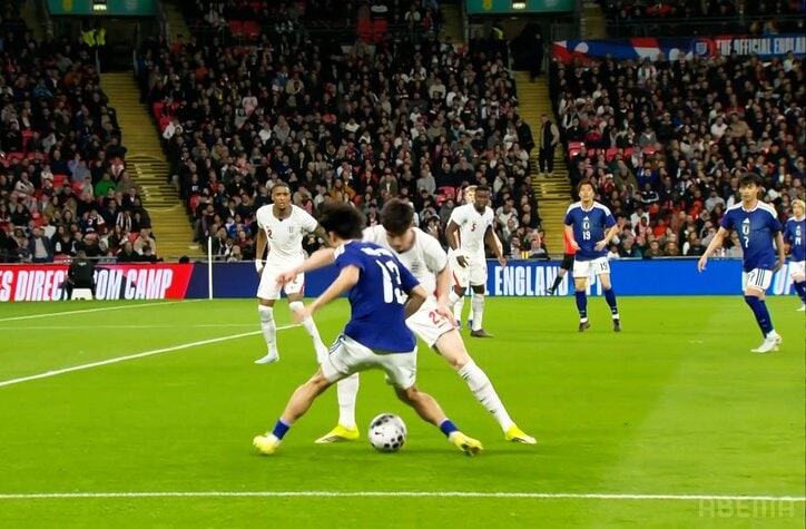 「プレミアリーグいけるぞ」中村敬斗の“ダンシング・フェイント”が話題!「独特の緩急」イングランドDFを華麗に翻弄 サッカー日本代表中村敬斗 2026/04/03 11:45 拡大する 【国際親善試合】イングランド代表 0-1 日本代表(日本時間4月1日/ウェンブリー・スタジアム) 歴史的快挙から2日が経過しても、その熱狂は冷めやらない。日本代表のMF中村敬斗が披露した“ダンシング・フェイント”による突破がSNSで拡散され続け、話題を呼んでいる。 日本代表は日本時間4月1日、キリンワールドチャレンジ2026(国際親善試合)でイングランド代表と聖地ウェンブリー・スタジアムで対戦し、1-0でサッカーの母国から歴史的初勝利を収めた。 続きを読む
