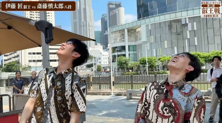 「速えぇ〜」伊藤叡王と斎藤八段が“お口あんぐり”!?若手&女流棋士のぶっ飛びチャレンジに反響「ナニコレw」「ガチの顔してる」 将棋 2026/04/03 14:53 拡大する 将棋の伊藤匠叡王(王座、23)に斎藤慎太郎八段(32)が挑戦する第11期叡王戦五番勝負が4月3日、シンガポールの「シンガポール日本人会」で行われている。大一番を前に、両対局者や同行した関係者らが現地で観光を楽しむ様子がABEMAの中継内で放送され、若手棋士たちによる体を張った“ぶっ飛びチャレンジ”がファンの大きな笑いを誘った。 時差調整なども含めて早めに現地入りしていた一行は、対局前のリフレッシュとしてシンガポール観光を満喫。華やかなプラナカンスタイルのシャツを選んでショッピングを楽しんだほか、人気観光地の「ガーデンズ・バイ・ザ・ベイ」などを訪問し、南国の異国情緒を味わった。 続きを読む