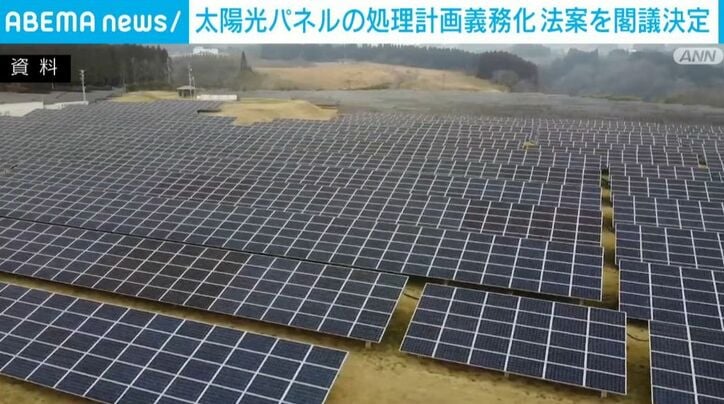 太陽光パネルの処理計画義務化 法案を閣議決定 速報 2026/04/03 16:09 拡大する 政府は、太陽光パネルのリサイクルに向けた取り組みをメガソーラー事業者などに義務付ける法案を閣議で決定しました。 太陽光パネルは、東日本大震災のあと再生可能エネルギーとして普及しましたが、寿命を迎える2030年代の後半から年間で最大50万トン程度の廃棄が見込まれ、埋立処分に支障が生じる恐れがあるとされています。 そこで政府は、メガソーラーなどの発電事業者にリサイクル計画を事前に提出することを義務付けるなどとした法案をまとめ、3日、閣議で決定しました。 続きを読む