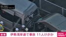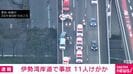 伊勢湾岸道で事故 11人けがか 速報 2026/04/03 18:39 【映像】事故現場付近の様子 この記事の写真をみる(2枚) きょう夕方、愛知県飛島村の伊勢湾岸道下りで、事故があり、11人がけがをしているという情報が入っています。【映像】事故現場付近の様子 警察によりますと、午後5時15分ごろ、飛島村木場の伊勢湾岸自動車道下り、飛島IC近くで、「追突事故があった」と通報がありました。現在警察が対応にあたっています。 事故の詳細はわかっていませんが、消防によりますと、11人がけがをしているということです。(ANNニュース) この記事の画像一覧 【映像】万博EVバスがハンドル操作不能→激突の瞬間 【画像】16歳だった元舞妓が飲酒させられている様子(複数カット) 「避妊できない」結婚11年で6人産んだかおりさん(40) この記事の写真をみる(2枚) Twitter