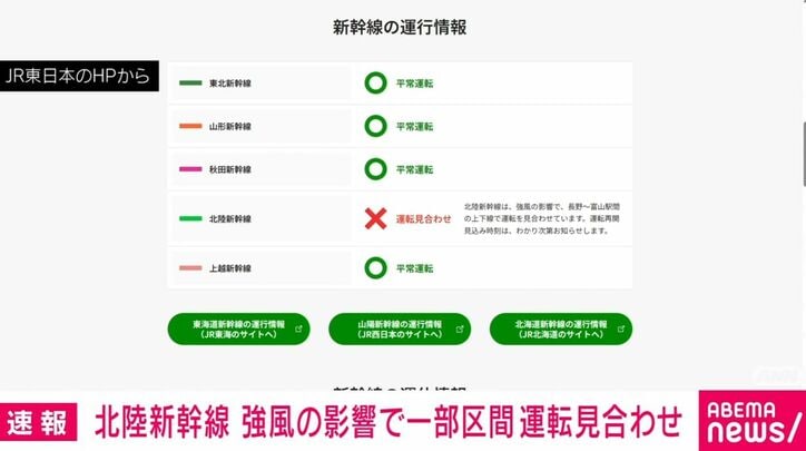 北陸新幹線 強風の影響で一部区間運転見合わせ 速報 2026/04/04 16:41 拡大する JR東日本によりますと北陸新幹線は、強風の影響で長野駅と富山駅の間の上下線で運転を見合わせています。 午後3時39分ころに、長野県の飯山駅と新潟県の上越妙高駅の間に設置されている風速計が規制値に達したためです。 運転再開の見込みはたっていません。(ANNニュース) 続きを読む