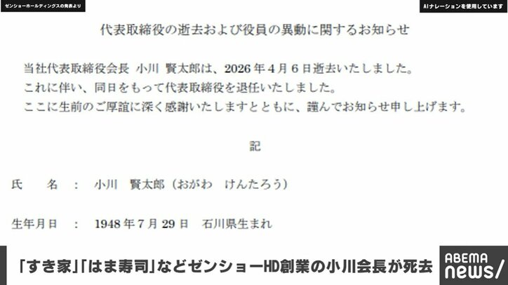「すき家」「はま寿司」などゼンショーHD創業の小川会長が死去 速報 2026/04/07 12:51 拡大する ゼンショーホールディングスからの発表です。「代表取締役の逝去および役員の異動に関するお知らせ当社代表取締役会長 小川 賢太郎は、2026年4月6日逝去いたしました。これに伴い、同日をもって代表取締役を退任いたしました。ここに生前のご厚誼に深く感謝いたしますとともに、謹んでお知らせ申し上げます。氏名:小川 賢太郎 生年月日:1948年7月29日 石川県生まれ 逝去日:2026年4月6日(享年77歳) その他:今回の異動に伴い、当社取締役は1名減員となりますが、法令及び定款に定める定足数は満たしております。 続きを読む