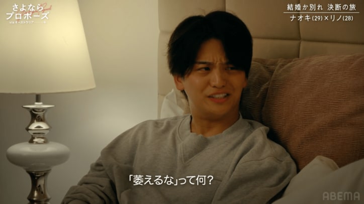 住宅ローン折半問題が激化!専業主婦希望の美人彼女「お金の話は萎える」ハイスペ彼氏からの家賃相談を完全拒絶で大修羅場 さよならプロポーズ 2026/04/09 23:00 拡大する 4月9日に放送されたABEMAオリジナル恋愛番組『さよならプロポーズ via オーストラリア』第6話にて、将来の家賃や生活費をめぐる話し合いが、彼女の“完全拒絶”によって大修羅場へと発展した。 同番組は、付き合いながらも結婚に踏み出せないカップルが、「結婚するか」「別れるか」を決断する“恋人として最後”の旅行に密着するリアリティ番組。意見をぶつけ合ったのは、結婚したら仕事をやめたい専業主婦志望の28歳美女インフルエンサー・リノと、外資系勤務で効率厨のハイスペック彼氏・ナオキだ。 続きを読む
