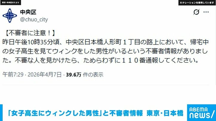 「女子高生にウィンクした男性」と不審者情報 東京・日本橋 速報 2026/04/07 14:13 拡大する 東京都中央区のXが更新されました。「不審者に注意! きのう午後10時35分頃、中央区日本橋人形町1丁目の路上において、帰宅中の女子高生を見てウィンクをした男性がいるという不審者情報がありました。不審な人を見かけたら、ためらわずに110番通報してください」(『ABEMA NEWS』より) 続きを読む