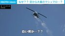 映像には、青空を飛ぶヘリコプターから、白い物体が大量にまかれる様子が映っている。上空をヘリコプターが通過すると、子どもたちから歓声が上がる。