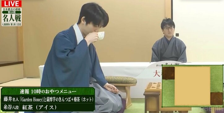 「どうやって食べるんだろう」藤井聡太名人が注文した“黄金色”おやつが話題「かけて食べる?」「お茶に入れるとか」 将棋藤井聡太 2026/04/08 11:30 拡大する 将棋の藤井聡太名人(竜王、王位、棋聖、棋王、王将、23)に糸谷哲郎八段(37)が挑戦する第84期名人戦七番勝負が4月8日、東京都文京区の「ホテル椿山荘東京」で行われている。盤上の熱戦とともにファンが熱い視線を注ぐのが、対局の合間に提供される「勝負おやつ」。午前10時のおやつで藤井名人が注文した一品と、その提供スタイルが視聴者の間で大きな話題を呼んだ。この日、午前のおやつとして藤井名人が選んだのは、「Garden Honey」と薩摩芋のきんつば、そしてホットの椿茶という心温まる組み合わせだった。ちなみに挑戦者の糸谷八段はおやつをオーダーせず、アイスの紅茶のみで対局に集中する姿勢を見せている。藤井名人に用意されたお盆には、鮮やかな黄色が美しい薩摩芋のきんつばに加え、桜を模した繊細な和菓子も添えられており、春という季節にふさわしい華やかなセットとなっていた。 続きを読む