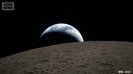 デコボコしたクレーターがある月と、その地平線に沈みゆく青い地球が見えます。