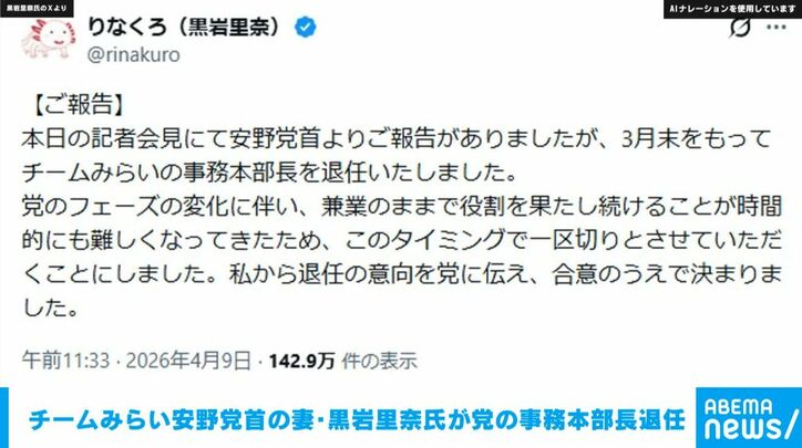 チームみらい安野党首の妻・黒岩里奈氏が党の事務本部長退任 速報 2026/04/09 23:55 拡大する 黒岩里奈さんのXが更新されました。「ご報告 本日の記者会見にて安野党首よりご報告がありましたが、 3月末をもってチームみらいの事務本部長を退任いたしました。 党のフェーズの変化に伴い、 兼業のままで役割を果たし続けることが時間的にも難しくなってきたため、このタイミングで一区切りとさせていただくことにしました。 私から退任の意向を党に伝え、合意のうえで決まりました」(『ABEMA NEWS』より) 続きを読む