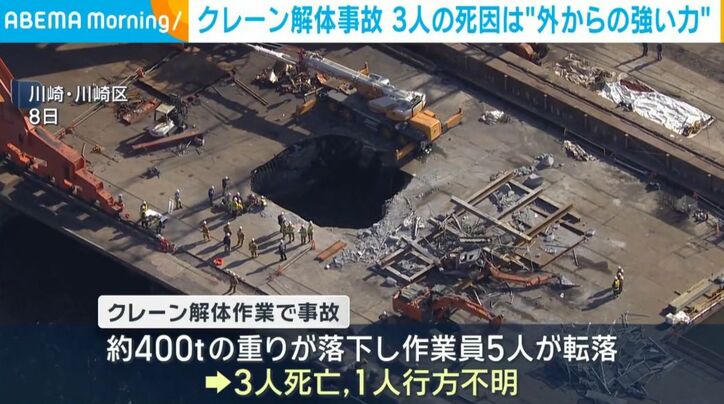 クレーン解体事故 3人の死因は“外からの強い力” 速報 2026/04/10 09:09 拡大する 川崎市でクレーンの解体作業中に3人が死亡し、1人が行方不明となっている事故で、3人はいずれも外から強い力が加わり死亡したことがわかりました。 川崎市で7日、クレーンの解体作業中におよそ400トンの重りが落下し、男性作業員5人が転落しました。 3人が死亡し、1人が行方不明のままです。 警察は3人の司法解剖を行い、死因はいずれも外から強い力が加わり、千葉ケン志朗さん(19)は全身打撲による外傷性ショック、小池湧さん(29)は、頭の骨を折ったことによる出血、上山勝己さん(43)は脳幹部損傷だと明らかにしました。 続きを読む