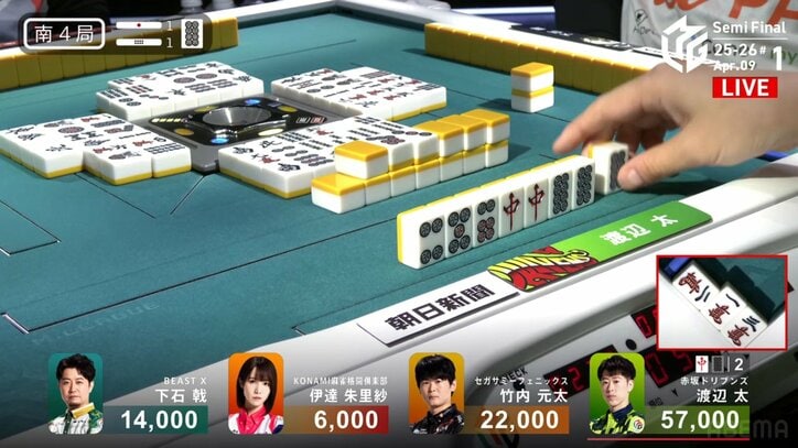“役なし”から急展開の嶺上開花・ドラ4 秀才雀士、衝撃のダメ押し打にチーム控室は大沸騰「まきどんの顔w」「盛り上がりすぎてる」/麻雀・Mリーグ Mリーグ 2026/04/10 14:00 拡大する 「ZOZOTOWN Mリーグ2025-26」セミファイナルシリーズ、4月9日の第1試合で、赤坂ドリブンズ・渡辺太(最高位戦)が、オーラスに奇跡のような嶺上開花を披露。役がないはずの牌で強引にアガリをもぎ取る離れ業に、視聴者も放送席も、そして控室のチームメイトも狂喜乱舞した。 場面は南4局1本場。序盤から圧倒的な加点を続けた渡辺は、5万7000点持ちのトップ目。2着目とは3万5000点もの大差があり、まさに何をやっても許される「王様タイム」の様相を呈していた。配牌こそアガリには遠い形だったが、4巡目にドラの8筒を重ねると、8巡目に二万をチーして一歩前進。10巡目には、役牌の中とドラ8筒のシャンポン待ちでテンパイを入れる。 続きを読む