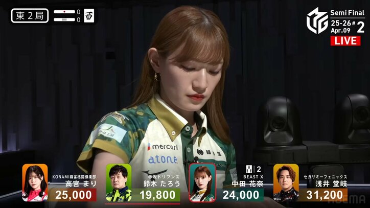 雀士としてブレイク中の中田花奈、熱血実況者「今期の覚醒はとんでもない!」成長を見せつける一発ツモに痺れるファン「成長した」「うまくなったよな!」/麻雀・Mリーグ Mリーグ 2026/04/10 15:00 拡大する 「ZOZOTOWN Mリーグ2025-26」セミファイナルシリーズ、4月9日の第2試合、BEAST Xの中田花奈(連盟)が、今シーズンの勢いを象徴するような鮮烈な一発ツモを披露。元アイドルの看板を脱ぎ捨て、一人の強豪雀士として覚醒した姿をあらためて世界に見せつけた。 場面は東2局。中田は2万4000点持ちの3着目。トップ目のセガサミーフェニックス・浅井堂岐(協会)を追う状況だった。配牌はマンズとソウズに両面ターツこそあるものの、ドラの西が孤立し、アガリまではまだ距離があるように見えた。しかし、4巡目にそのドラの西を重ねると、中田の指先が加速する。 続きを読む