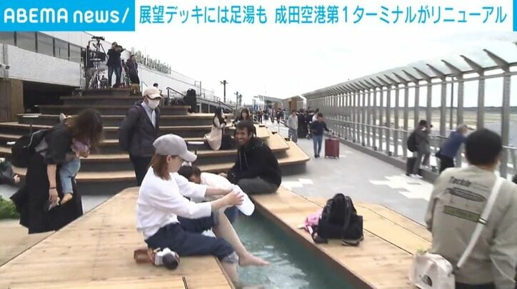 展望デッキには足湯も 成田空港第1ターミナルがリニューアル 速報 2026/04/10 16:11 拡大する 成田空港第1ターミナルの5階がリニューアルし、新たに日本の文化や四季をテーマにしたエリアがオープンしました。 9日、およそ1年間にわたって改装工事をしていた成田空港の第1ターミナル5階がリニューアルオープンしました。 日本の四季をテーマにしたエリアになっていて、竹で出来た大きなアートや靴を脱いでくつろげる3種類のリラックスエリアなど随所に日本の文化を感じる作りになっています。 また、展望デッキには、新たに足湯が設けられたほか、8段の高さがあるマウンテンデッキが完成し、フェンスに遮られることなく、滑走路を眺めることができます。 続きを読む
