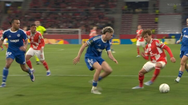 佐野海舟が「マジでエグい」 マーク2人をダブルタッチで抜き去る驚異の突破「うますぎて笑えてくる」称賛の声 サッカー佐野海舟 2026/04/10 21:50 拡大する 【UEFAカンファレンスリーグ】マインツ 2-0 ストラスブール(日本時間4月10日/メーヴァ・アレーナ) マインツに所属する日本代表MFの佐野海舟が、圧巻のテクニックでDF3人を一瞬で翻弄。切れ味鋭い“高速ダブルタッチ”に、現地サポーターたちが大歓声を送っている。 マインツは日本時間4月10日、UEFAカンファレンスリーグの準々決勝ファーストレグでストラスブールとホームで対戦。佐野はアンカーとして、MF川﨑颯太はインサイドハーフとして揃って先発出場した。 続きを読む