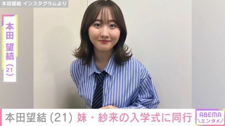 体重10kg減を公表した本田望結(21)、妹・本田紗来(19)が大学生に 入学式の姉妹ショットに反響 ABEMAエンタメ本田望結,本田紗来 2026/04/10 17:30 拡大する 俳優でフィギュアスケーターの本田望結(21)が9日、Xを更新。モデルやタレントとして活動している妹・本田紗来(19)の入学式に同行したことを明かした。 Instagramでは、「大人の女性だ」「誰だかわからなかった」など、驚きの声が寄せられた“激変”ショットや、「まさに氷上の天使!」「決めポーズかっこいい!からのかわいい!!」などの反響が寄せられたスケートリンクでの動画などを投稿している本田。 また、21歳の誕生日を報告した2025年6月2日には、「食生活が、もりもりご飯から、おつまみに変わったら、体が10kg軽くなりました!かんぱーーい」と体の変化について明かし、話題になっていた。 続きを読む