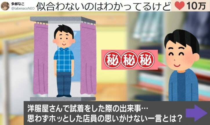 似合わないと分かっているけど試着→店員の絶妙すぎる一言に「変に褒められるより逆に信用できる」「じわじわ来ますね!」などの声 わたしとニュース 2026/04/11 11:30 拡大する 洋服店で試着した際の店員の思いがけない一言が、話題を呼んでいる。 投稿したのは、多部なこさん(@tabenacoNEO)。「似合わないのは分かっているけど、一応一回だけ着てみようかな…」と思いながらスカジャンを試着したところ、店員から「おっ、挑戦したなって…感じですね!」という正直かつ絶妙な一言をかけられた出来事をXに投稿した。以来、投稿者は「洋服屋さんの店員って意外と本心で話してくれているのかも」と、店員に信頼感を抱いたという。 続きを読む