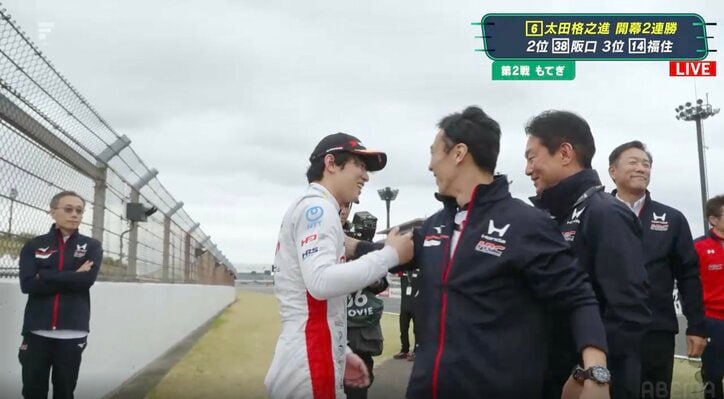 大物元F1ドライバーが「いるじゃん」 国内最速レース、ホンダの新星祝うレジェンドの姿に「変わらないな」反響 スーパーフォーミュラ 2026/04/11 11:30 拡大する 【スーパーフォーミュラ】第2戦(決勝・4月5日/モビリティリゾートもてぎ) 国内最高峰のスピードを誇るスーパーフォーミュラ(SF)第2戦は、ホンダのお膝元であるモビリティリゾートもてぎで開催された。ポールポジションからスタートした太田格之進(#6 DOCOMO TEAM DANDELION RACING)が、同じホンダ陣営の岩佐歩夢(#15 TEAM MUGEN)らを退け、開幕2連勝となる完璧なポール・トゥ・ウィンを飾った。 続きを読む