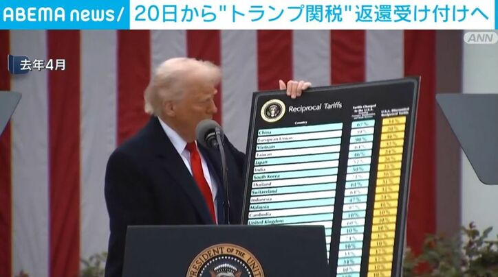 20日から“トランプ関税”返還受け付けへ 速報 2026/04/11 13:53 拡大する アメリカで、“トランプ関税”の返還申請の受付が20日から始まると発表されました。 “トランプ関税”をめぐっては、アメリカの連邦最高裁が2月違法と判断したことを受けて、国際貿易裁判所はトランプ政権に対して、企業への返還を始めるよう命じていました。 CBP=アメリカ税関・国境警備局は10日、トランプ政権が「国際緊急経済権限法」を根拠に徴収した「相互関税」などについて、20日から返還申請を受け付けると発表しました。 続きを読む