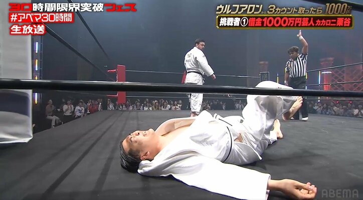 「恐怖で泣いてた」ウルフアロン、借金1000万円芸人をマジ刈り “東京五輪決勝と同じ形”に同情の声も 30時間限界突破フェス,ウルフアロンから3カウント取ったら1000万円 2026/04/11 18:08 拡大する 11日に『ウルフアロンから3カウント取ったら1000万円』が行われ、カカロニの栗谷がウルフアロンに“東京五輪決勝と同じ形”でマジ刈りされて完敗。試合後、「恐怖で泣いてた」と芸人仲間が証言する一幕があった。 35歳まで交際経験がなく「童貞芸人」としてバラエティ番組で人気を博した栗谷。その後、マッチングアプリで出会った女性と、2025年末に結婚。しかし今年3月に詐欺被害に遭ったことを告白、出演した番組では「1300万騙されて、300万円は返したんですけど、借金が1000万円あり、Uber Eatsで働き始めました」と報告していた。 続きを読む