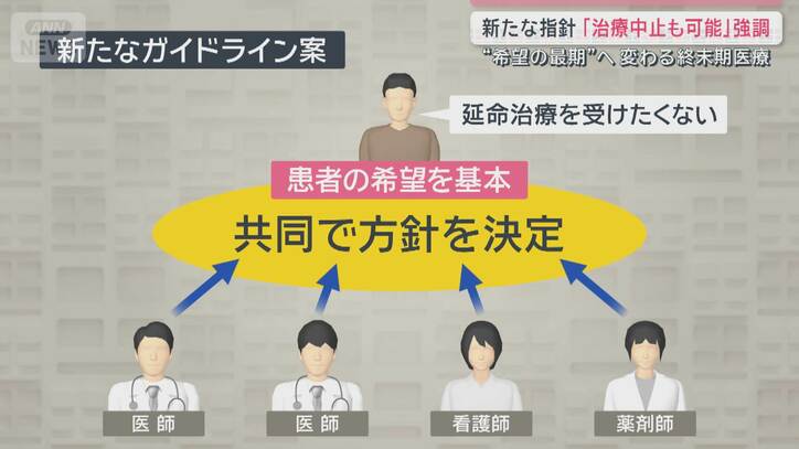 そこで新たなガイドライン案では、一度始めた延命治療でも途中でやめることができると強調されました。また、患者の希望を基本としたうえで、医師や看護師など、複数の職種のスタッフで方針を話し合い、共同で最終的な意思決定をするなど、方針を決めるプロセスも明記されています。
