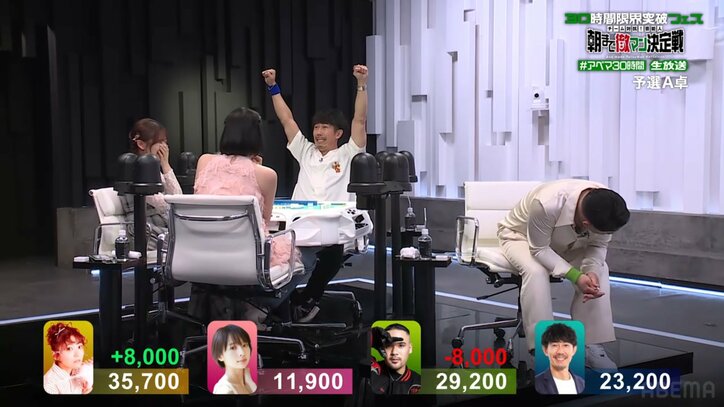 人気ラッパー・CHICO CARLITOの目に涙…?麻雀企画でまさかの大逆転負け「申し訳ない」スタジオ絶叫 30時間限界突破フェス,チーム対抗!芸能人朝まで徹マン決定戦 2026/04/12 04:30 拡大する 「30時間限界突破フェス・チーム対抗!芸能人朝まで徹マン決定戦」の予選A卓は、最終盤にドラマが待っていた。南4局、ラッパーのCHICO CARLITOとグラビアアイドルの天木じゅんのチームは、2万9200点持ちの2着目。このまま逃げ切れば決勝進出という盤石の状況で、最後の一局をCHICOに託した。 対するトップ目は、3万5700点持ちの日本バレーボール協会会長・川合俊一、歌手・声優・プロ雀士の武田雛歩のペア。CHICOの配牌はソウズで1面子、その他も面子候補が揃う好配牌。うまくかわしてアガりきり、2着を確保したいCHICOは、序盤から積極的に鳴きを入れ、234の三色同順などを狙う鮮やかな手順を見せる。 続きを読む