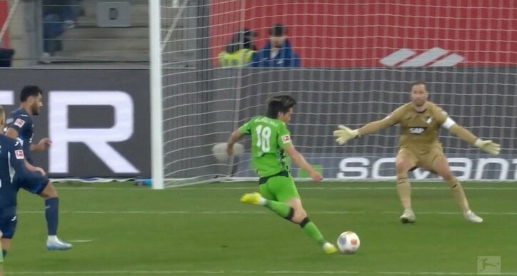 今季の町野はここまで3ゴールを挙げている。その中で最も注目されたのが、第17節、アウェイのホッフェンハイム戦だ。ベンチスタートだった町野は4点を追いかける56分に登場。すると、69分に圧巻のゴールをあげる。