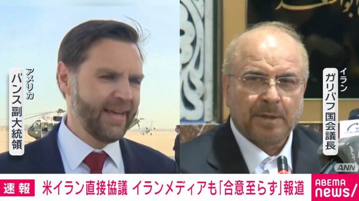 イランメディアも米イラン「合意至らず」と報じる 速報 2026/04/12 12:08 拡大する イランメディアも戦闘終結に向けた直接協議は合意に至らなかったと報じました。 イランのタスニム通信もさきほど、「イランとアメリカの協議は終わり、交渉は成立しなかった」と報じました。 12日、交渉が終わったとみられるタイミングでイラン政府はSNSに「双方の技術チームが文書のやり取りをしている」と投稿し、相違点が残っているとしながらも、交渉を継続するとしていました。 またその後、パキスタンの提案によって12日に協議を再開するとも発表していました。現地時間11日の夕方から始まった協議は、12日未明までおよそ14時間にわたって続いたということです。 続きを読む