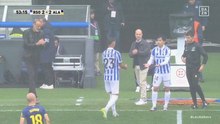 日本代表・久保建英に盛大なスタンディングオベーション「愛されてるな」「待っていたよたけちゃん」83日ぶりの復帰にホームスタジアム総立ち&大歓声 ラ・リーガ久保建英 2026/04/12 12:25 拡大する 【ラ・リーガ】ソシエダ3-3アラベス(日本時間4月11日/アノエタ) 待ちに待ったシーンに、世界中のファンが歓喜した。ソシエダに所属する日本代表MF久保建英が83日ぶりに負傷明けのピッチに立つと、ホームに詰めかけたサポーターが立ち上がって拍手で迎え入れ、ネット上でも多くのファンが喜びの声を寄せている。 日本時間4月11日、ラ・リーガの第31節でソシエダはホームでアラベスと対戦。この試合の注目の一つは、チームを支える背番号14の登場タイミングだった。久保は1月18日の第20節バルセロナ戦の左太もも裏負傷により離脱。前節レバンテ戦はベンチ入りしたものの出番はなく、今節の出場が期待されていた。そんな中、待望の瞬間は後半に訪れた。 続きを読む