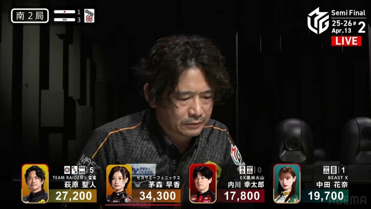 ドラ、何枚あるんだ…スターのもとに訪れた超絶“オールスター配牌”萩原聖人が演じきった豪華すぎる「倍満ショー」がアツい「手震えとる」「ハギー大勝利」/麻雀・Mリーグ Mリーグ 2026/04/14 14:00 拡大する 「ZOZOTOWN Mリーグ2025-26」セミファイナルシリーズ。4月13日の第2試合、TEAM雷電・萩原聖人(連盟)が、麻雀の神様に愛されたかのような「究極の配牌」を手にし、興奮の倍満劇を披露した。 場面は南2局3本場。2着目に付けていた萩原の配牌が開いた瞬間、放送席に衝撃が走る。そこには赤五万・赤5筒・赤5索が1枚ずつ揃い踏み。さらに形も整っており、実況の小林未沙とプレーヤー解説のU-NEXT Pirates・瑞原明奈(最高位戦)が声を揃えて「すごい!」と絶叫。瑞原は「形がべらぼうにいいですよ」と期待を寄せた。 続きを読む