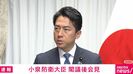 小泉大臣は「4月12日に開かれた自民党大会において、陸上自衛官が国歌を歌唱したことについては承知をしています。当該自衛官は職務ではなく私人として、関係者からの依頼を受けて国歌を歌唱したものと聞いています。またお尋ねの政治的行為の制限との関係については、自衛隊法第61条第1項において隊員の政治的行為の制限について定められていますが、国歌を歌唱することが政治的行為に当たるものでもなく、今回の件は自衛隊法違反に当たらないと認識しています」と答えた。