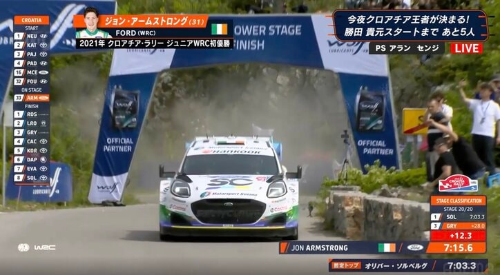 世界ラリー、目の前で「乗り上げた!」衝撃光景 土手にヒットも激走、観客「びっくり」思わず後退りする姿…中継で話題に WRC 2026/04/14 12:09 拡大する 【WRC世界ラリー選手権】第4戦 クロアチア・ラリー(4月10日〜12日) 日本人ドライバーの勝田貴元が逆転で2連勝を飾ったWRC(世界ラリー選手権)第4戦は、滑りやすいトリッキーな路面が牙を剥き、トラブルが続出したが、その中でフォードのマシンが危うくコースアウトしかけた衝撃の光景が見られた。 クロアチア・ラリーは、全ステージがターマック(舗装路)で行われるが、農道や林道で他車が走ることでコース上に砂利や泥がたまって滑りやすくなる。ドライバーには路面状況の変化を読んで瞬時に判断することが求められる、想像以上にハードなラリーだ。フォードのジョン・アームストロングは31歳のアイルランド人ドライバー。5年前にジュニアWRCのクロアチア・ラリーで優勝を果たして得意としており、今季が初めてのトップカテゴリーへのチャレンジながら、競技初日からステージ2位や3位を獲得していた。 続きを読む