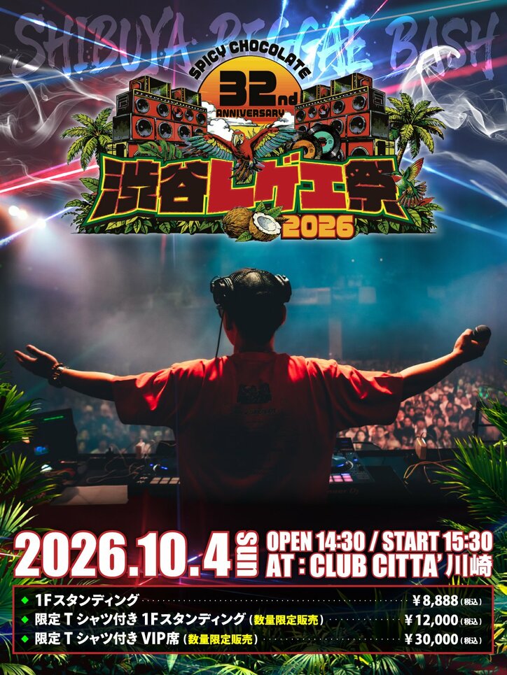SPICY CHOCOLATE主催 「渋谷レゲエ祭2026」 10月4日(日)開催決定 2026/04/14 13:48 拡大する SPICY CHOCOLATEが主催するレゲエフェス「渋谷レゲエ祭2026」が、10月4日(日)川崎CLUB CITTA’にて開催されることが発表された。MIX CDのように、1曲ごとにアーティストが入れ替わり登場するノンストップスタイルのレゲエフェス。 2009年からスタートし、今年で18回目の開催となる。開催決定の告知に伴い、明日12日(日)12:00より、チケットの最速先着先行の受付が決定。例年完売のフェスになっているので、お見逃しなく。 なお、SPICY CHOCOLATEは、 4月15日に新曲「離れても好きな人 feat. Sugar Goose, Albert Connor & REKID」のリリースを予定している。 続きを読む