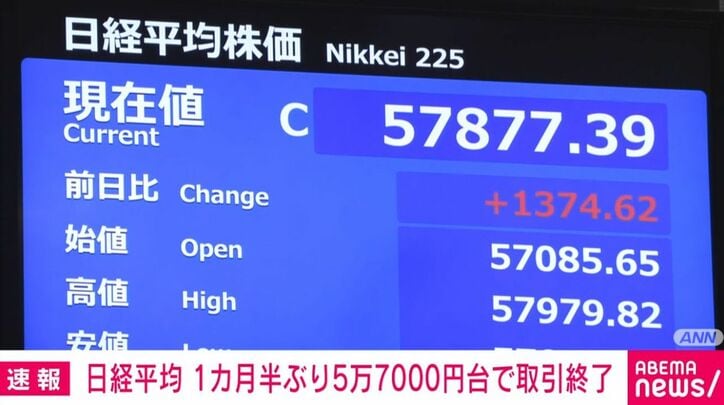 日経平均 1カ月半ぶり5万7000円台で取引終了 速報 2026/04/14 16:39 拡大する 日経平均株価は、およそ1カ月半ぶりに5万7000円台で取り引きを終えました。 アメリカとイランの協議継続への期待感から、きょうの日経平均は取引開始から上昇し、上げ幅は一時1400円を超えました。 午後に入ってもAI・半導体関連株が押し上げる形で一進一退を続け、終値はきのうより1374円高い5万7877円でした。 終値が5万7000円を超えたのは、アメリカなどによるイランへの軍事攻撃開始後最初の取り引きとなった3月2日以来およそ1カ月半ぶりです。(ANNニュース) 続きを読む